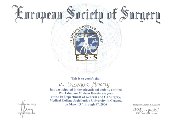 I stopień specjalizacji z zakresu chirurgii ogólnej uzyskałem w roku 1998, a II stopień w roku 2003 pod kierunkiem